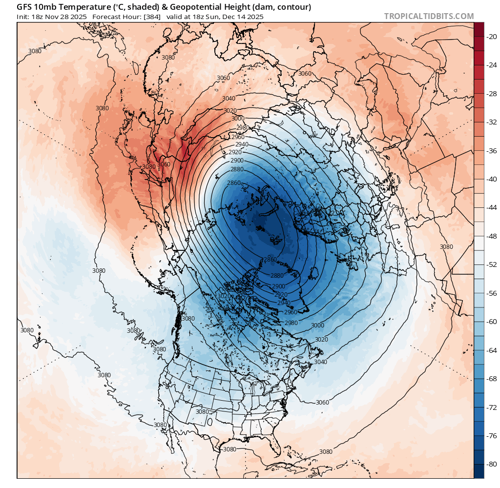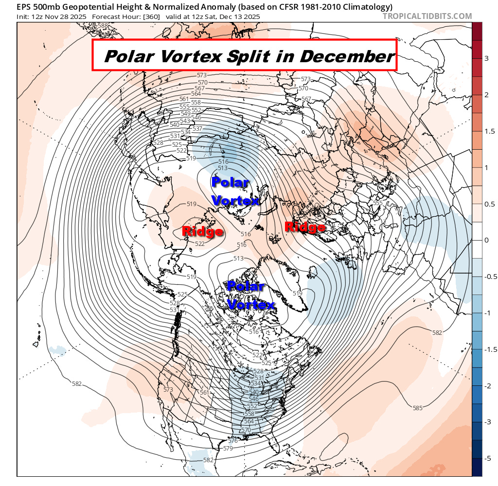 The European even though it has struggled with too much western trough shown out in the distance, it usually corrects itself within a few days. And lately it’s much colder than the GFS in the extended. Lately its ensembles are more Wintery looking for the eastern half of the nation with some weak Greenland ridging hold on, but more impressive when you view the entire Northern Hemisphere. There’s a huge ridge in the means north of Alaska, and another big one over the Scandinavian region touching Greenland and the Synoptics of this flow, looks to mean a splitting of the Polar Vortex (that is the potential result of the warming now seen at 10 mb of the upper stratosphere). Only time will tell if there will be 2 Polar Vortices in mid December, but overall it makes sense in the means and jives with the Canadian and GFS as well generally. It’s not a Brutally cold pattern look for the eastern USA, but a definitely colder than normal pattern….but I will say considering the trending going on lately, there’s room for this to trend much colder in the center and eastern part of the country in the first half of December. A touch more west Canada ridging linking up with that Alaska ridge, and suddenly we’d have Cross-Polar Flow, which no model is showing but this could happen.